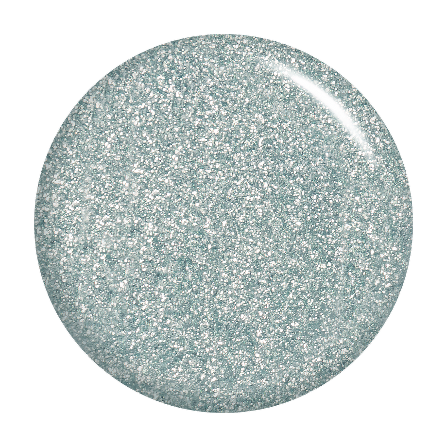Silver with pale blue tint. Metallic foil sparkle. Opaque. Cool undertone.